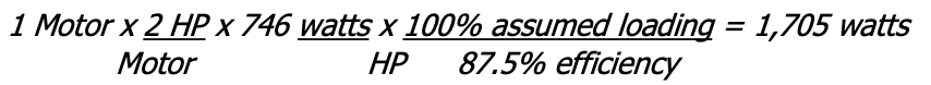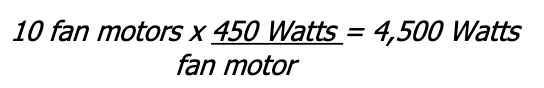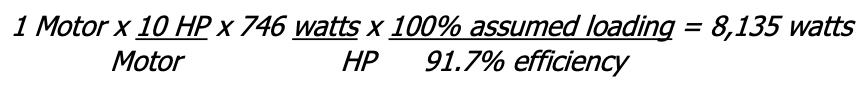 To calculate input power, we will assume 100 percent fan and pump motor loading and minimum motor efficiencies since the manufacturer has not yet published actual motor specific efficiency at the specific efficiency rating conditions. We look up the minimum motor efficiency from Nonresidential Appendix NA-3: Fan Motor Efficiencies. For a 10 HP six-pole open fan motor, the minimum efficiency is 91.7 percent. For a 2 HP six-pole open pump motor, the minimum efficiency is 87.5 percent. The fan motor input power is calculated to be: