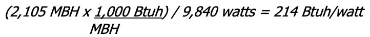 (550MBH x 1,000 Btu/hr/MBH) / 9000 watts = 61 Btu/hr/watts