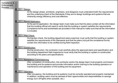 The process of complying with and enforcing the Energy Standards involves many parties. Those involved may include the architect or building designer, building developers, purchasing agent, general contractor, subcontractors/installers, energy consultant, plans examiners, inspectors, realtors, the building owner, and third party inspectors (HERS raters). Communication between these parties is essential for the compliance/enforcement process to run efficiently.