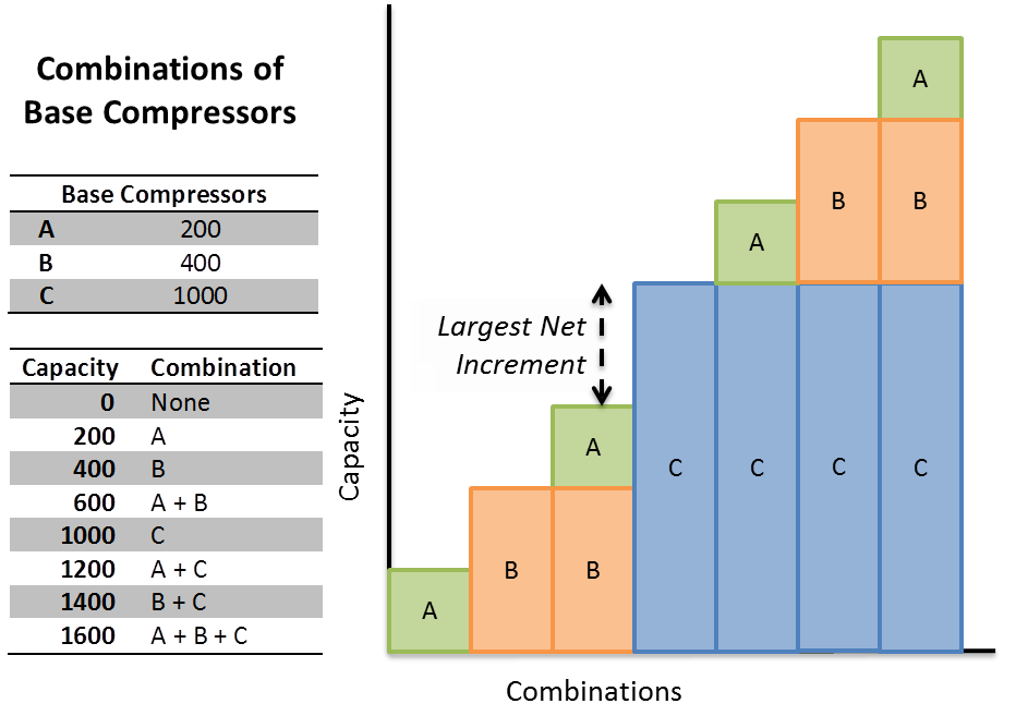 Many base load compressors are designed to provide peak efficiency near their rated capacity with a significant drop off in efficiency at lower flow rates (in acfm). Compressed air systems often avoid the losses in efficiency associated with part load compressed air flows by staging multiple compressors so that in most cases base compressors operate near full load. A trim compressor is designed to have close to peak efficiency over a broad range of compressed air flow rates. To make sure the compressed air system is operating efficiently over its entire range, it is important to have a trim compressor sized to handle the gaps between base compressors. The minimum size of the trim compressor(s) is determined calculating the Largest Net Capacity Increment - the biggest step increase between combinations of base compressors.