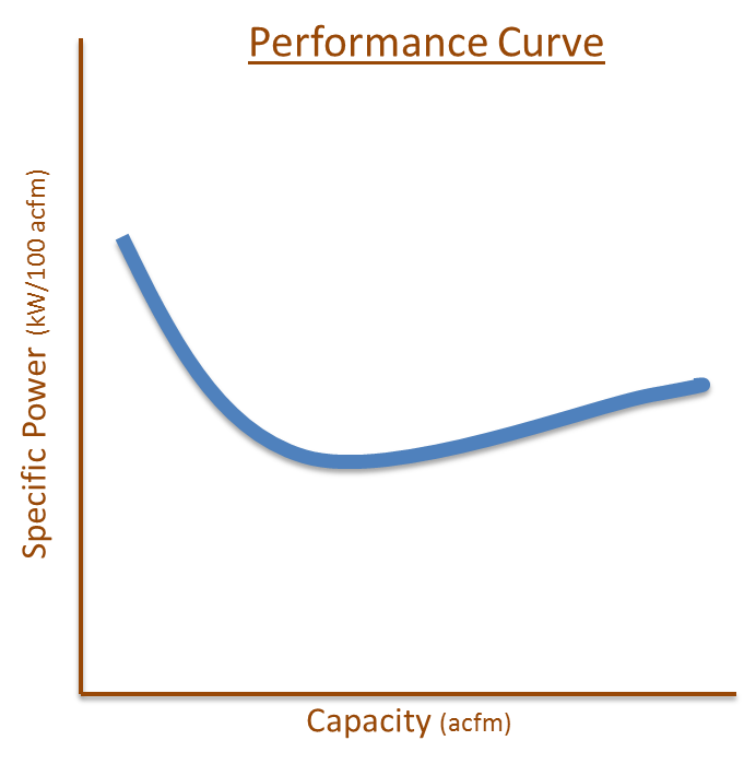 The capacity of the compressor is along the x-axis, while the power is on the y-axis. The curve in Figure 10-41 is a typical shape of a performance curve for a VSD compressor. The lower the specific power, the more energy efficient the compressor is at that condition.
