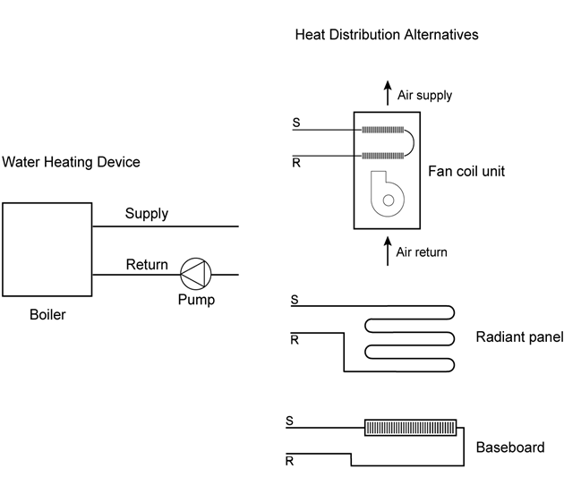 A hydronic heating system consists of a heat source, which is either a boiler or water heater, and a distribution system. There are three main types of hydronic distribution systems, and they may be used individually or in combination: baseboard convectors or radiators, hot water air handlers, and radiant panel heating systems. These three options are illustrated in Figure 4-32.