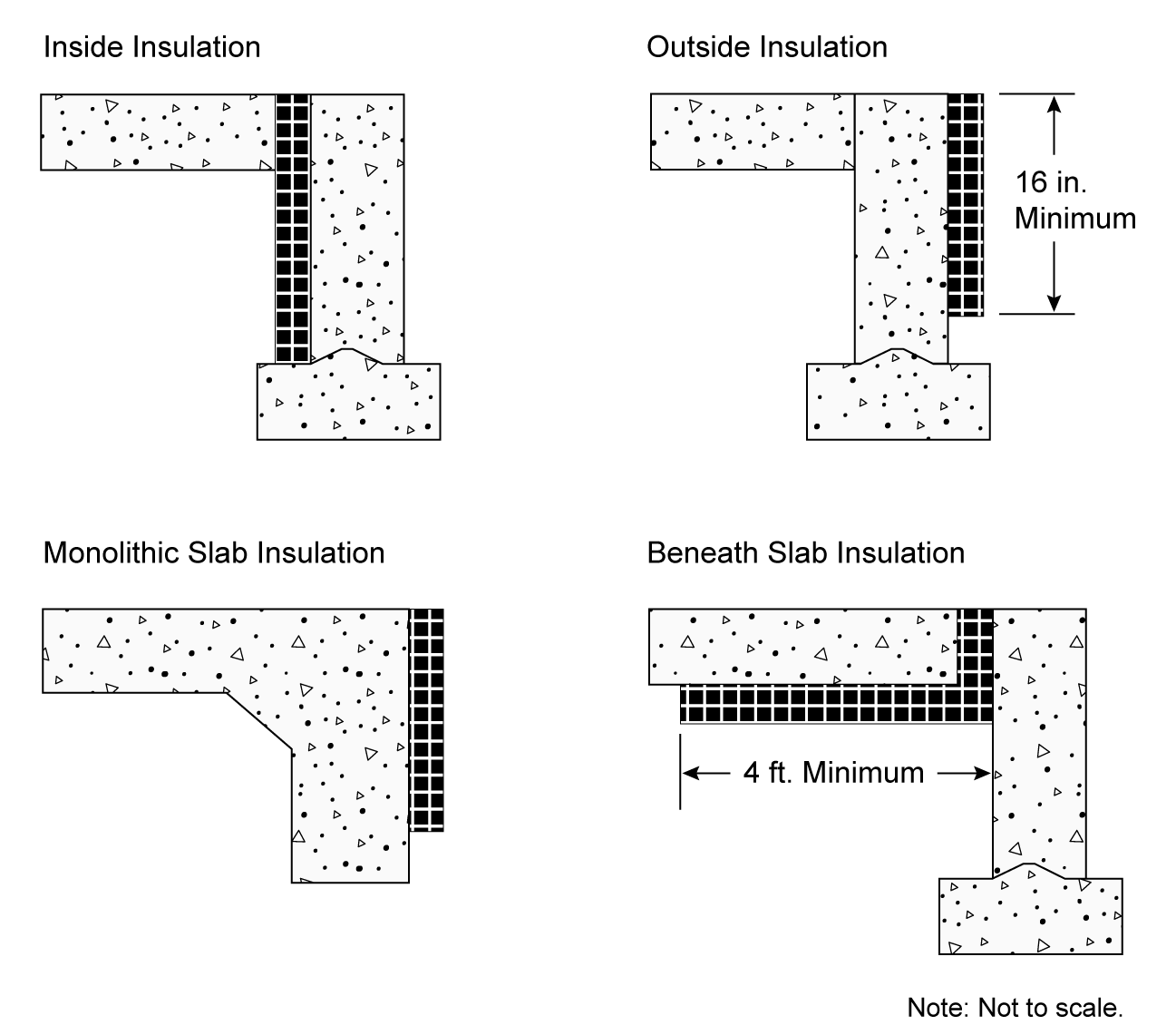 Slab edge insulation applied to basement or retaining walls (with heated slab below grade) must be installed so that insulation starts at or above ground level and extends down to the bottom of the foundation or to the frost line, whichever is greater.