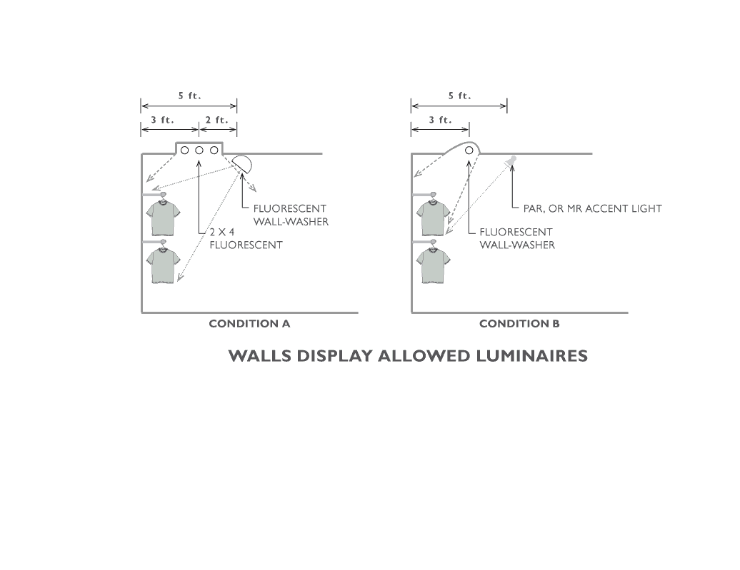 To determine maximum allowed lighting power for the sales floor it is also necessary to identify the lineal foot of qualifying walls eligible for wall display. Total maximum watts for the sales floor is then determined by using the allowed LPD (from Table 140.6-G) for general lighting based on the RCR of the space and the LPD for allowed floor display, wall display and ornamental effect lighting (columns 2, 3, 4 from Table 140.6-D).